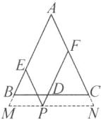 (3)如图,过点P作MN//BC,分别交AB,AC的延长线于M,N两点。因为PE//AC,PF//AB,所以∠EPM = ∠ANM,四边形PEAF是平行四边形。所以PF = AE。因为AB = AC,所以∠ABC = ∠ACB。因为MN//BC,所以∠ANM = ∠ACB,∠ABC = ∠AMN,四边形BDPM是平行四边形。所以MB = PD。所以∠EPM = ∠EMP,即PE = ME。因为AE + ME = AM,所以PE + PF = AM = AB + PD。又AB = 6,PD = 1,所以PE + PF = 7。所以平行四边形PEAF的周长为2(PE + PF)= 14。