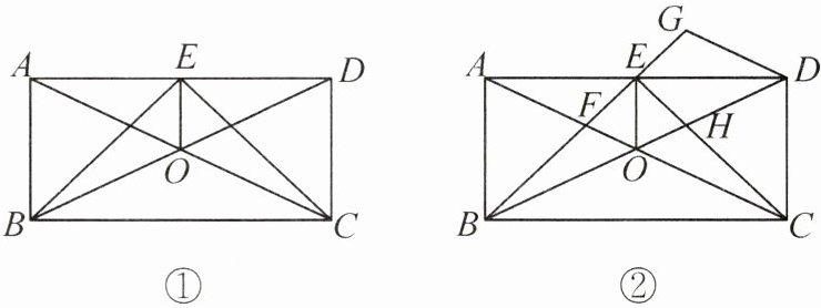 (2)△DEH,△CHO,△DEG,△BFO的面积都与△AEF的面积相等. 解析:因为四边形ABCD是矩形,所以AB=DC,OA=OD,∠BAE=∠CDE=90°.所以∠FAE=∠HDE.又BE=CE,所以Rt△ABE≌Rt△DCE(HL).所以∠FEA=∠HED,AE=DE.所以△AEF≌△DEH(ASA),OE垂直平分AD.所以$S_{\triangle AEF}=S_{\triangle DEH}$,∠OED=∠OEA=90°.所以OE//AB.所以$S_{\triangle AOE}=S_{\triangle BOE}$.所以$S_{\triangle BOE}-S_{\triangle OEF}=S_{\triangle AOE}-S_{\triangle OEF}$,即$S_{\triangle BFO}=S_{\triangle AEF}$.同理,得$S_{\triangle DEH}=S_{\triangle CHO}$.所以$S_{\triangle CHO}=S_{\triangle AEF}$.因为DG//AC,所以∠G=∠AFE,∠GDE=∠FAE.所以△DEG≌△AEF(AAS),即$S_{\triangle DEG}=S_{\triangle AEF}$.综上,△DEH,△CHO,△DEG,△BFO的面积都与△AEF的面积相等.