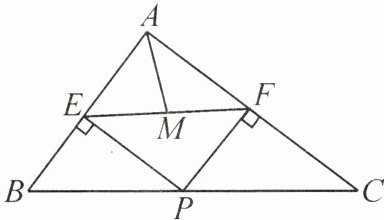 因为 $PE ⊥ AB$,$PF ⊥ AC$,所以 $\angle AEP = \angle AFP = 90°$,则四边形 $AEPF$ 是矩形,因此 $AP = EF$。