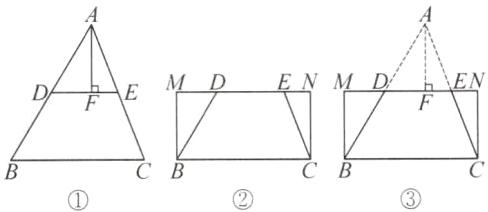 (3) 矩形. 理由如下:如图③,由题意,得 BM = CN = AF,∠BDM = ∠ADE,∠CEN = ∠AED,∠AFD = ∠M,∠AFE = ∠N. 又 ∠ADE + ∠BDE = ∠AED + ∠DEC = 180°,所以 ∠MDB + ∠BDE = 180°,∠DEC + ∠CEN = 180°,即 M,D,E,N 四点在一条直线上. 因为 AF ⊥ DE,所以 ∠AFD = ∠AFE = 90°,即 ∠M = ∠N = 90°. 所以 ∠M + ∠N = 180°,即 BM // CN. 所以四边形 MBCN 为平行四边形,即四边形 MBCN 为矩形.(答案不唯一,与(2)中图形对应即可)