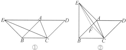 答案:12.2或$2 - \sqrt{2}$ 解析:因为四边形ABCD是周长为8的菱形,∠ABC+∠ADC=90°,所以∠ABC=∠ADC=45°,AB=BC=CD=AD=2.分类讨论如下:①如图①,当AB=BE,即∠EAB=∠AEB=45°时,因为∠EAB=∠ABC=45°,所以AE//BC.所以$S_{\triangle ACE}=S_{\triangle ABE}$.又∠EAB+∠AEB+∠ABE=180°,所以∠ABE=180° - ∠EAB - ∠AEB=90°.所以$S_{\triangle ACE}=S_{\triangle ABE}=\frac{1}{2}AB· BE=\frac{1}{2}AB^{2}=2$;②如图②,当AB=AE,即∠ABE=∠AEB=45°时,过点C作CF⊥AB于点F,连接EF,则∠CFA=90°.又∠ABE+∠AEB+∠BAE=180°,所以∠BAE=180° - ∠ABE - ∠AEB=90°,即∠BAE=∠CFA.所以AE//CF.所以$S_{\triangle ACE}=S_{\triangle AFE}$.又∠ABC+∠BCF=90°,所以∠BCF=90° - ∠ABC=45°,即∠ABC=∠BCF.所以BF=CF.在Rt△BCF中,由勾股定理,得$BF^{2}+CF^{2}=BC^{2}$,解得$BF=CF=\sqrt{2}$.所以$AF=AB - BF=2 - \sqrt{2}$.所以$S_{\triangle ACE}=S_{\triangle AFE}=\frac{1}{2}AE· AF=\frac{1}{2}AB· AF=2 - \sqrt{2}$.综上,△ACE的面积为2或$2 - \sqrt{2}$.