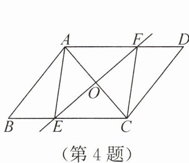 开放探究 如图,在 $□ ABCD$ 中,过 $AC$ 的中点 $O$ 的直线分别交边 $BC$,$AD$ 于 $E$,$F$ 两点,连接 $AE$,$CF$。若添加一个条件使四边形 $AECF$ 是菱形,则这个条件可以是