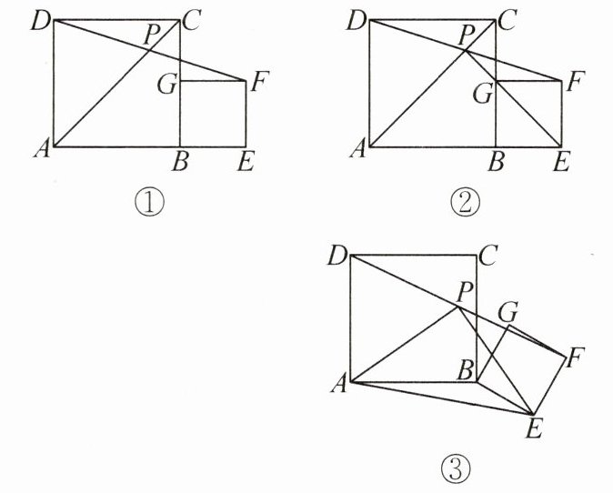 (3)△APE的形状不改变.理由如下:延长EP至点M,使MP=EP,连接MA,MD.因为四边形ABCD和四边形BEFG都是正方形,所以AB=AD,AD//BC,∠BAD=∠ABC=∠EBG=90°,EB=EF,BG//EF.因为P为DF的中点,所以PD=PF.因为∠DPM=∠FPE,所以△MPD≌△EPF(SAS).所以MD=EF,∠DMP=∠FEP.所以EB=MD,DM//EF,即BG//DM.设DF交BC于点H,交BG于点N,则∠MDN=∠DNB.因为AD//BC,所以∠ADN=∠BHN.因为∠BHN+∠BNH+∠HBN=180°,所以∠ADM=∠ADN+∠MDN=∠BHN+∠BNH=180°−∠HBN.因为∠ABE=360°−∠ABC−∠EBG−∠HBN=180°−∠HBN,所以∠ADM=∠ABE.所以△ADM≌△ABE(SAS).所以AM=AE,∠DAM=∠BAE.所以AP⊥ME,即∠APE=90°.因为∠DAM+∠MAB=90°,所以∠BAE+∠MAB=90°,即∠MAE=90°.所以∠MAP=∠PAE=45°,即∠PEA=90°−∠PAE=45°.所以∠PAE=∠PEA.所以AP=EP,即△APE是等腰直角三角形.