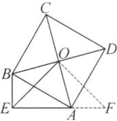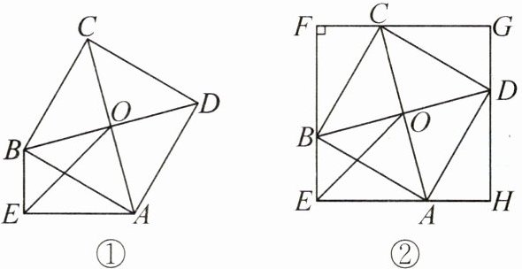 推导探究 如图 ①,在 $Rt\triangle AEB$ 中,$\angle AEB = 90^{\circ}$,以斜边 $AB$ 为边向上作正方形 $ABCD$,且正方形 $ABCD$ 的对角线交于点 $O$,连接 $OE$。
