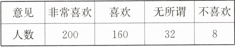 答案:5.(1)由题表,得“非常喜欢”的人数占总调查人数的百分比为$\frac{200}{400}$×100%=50%;“喜欢”的人数占总调查人数的百分比为$\frac{160}{400}$×100%=40%;“无所谓”的人数占总调查人数的百分比为$\frac{32}{400}$×100%=8%;“不喜欢”的人数占总调查人数的百分比为$\frac{8}{400}$×100%=2%.