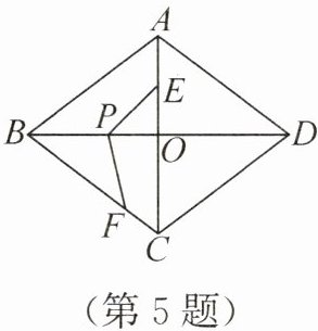 5. 如图,在菱形 $ ABCD $ 中,对角线 $ AC $,$ BD $ 交于点 $ O $,$ AC = 6 $,$ BD = 8 $,$ E $ 为 $ OA $ 的中点,$ F $ 为 $ BC $ 上一点,且 $ BF = 3CF $,$ P $ 为 $ BD $ 上一动点,连接 $ PE $,$ PF $,则 $ |PF - PE| $ 的最大值为