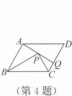 答案:4. 2 ≤ m ≤ 4 解析:因为四边形ABCD是平行四边形,所以AB // CD,AD // BC,AB = CD,AD = BC,即∠ABC + ∠BCD = 180°.因为BP平分∠ABC,CP平分∠BCD,所以$∠ABP = ∠PBC = \frac{1}{2}∠ABC,$$∠PCD = ∠PCB = \frac{1}{2}∠BCD.$如图①,当点Q与点C重合时,m取最大值.因为CA平分∠BCD,所以∠ACD = ∠ACB.因为AB // CD,所以∠BAC = ∠ACD,即∠BAC = ∠ACB.所以AB = BC.又AB = m,BC = 4.所以m = 4;如图②,当点Q与点D重合时,m取最小值.因为AD // BC,所以∠APB = ∠PBC,∠DPC = ∠PCB.所以∠ABP = ∠APB,∠DPC = ∠PCD,即AB = AP,CD = PD.又AP + PD = AD,所以BC = 2AB.又AB = m,BC = 4,所以m = 2.综上,m的取值范围是2 ≤ m ≤ 4.
