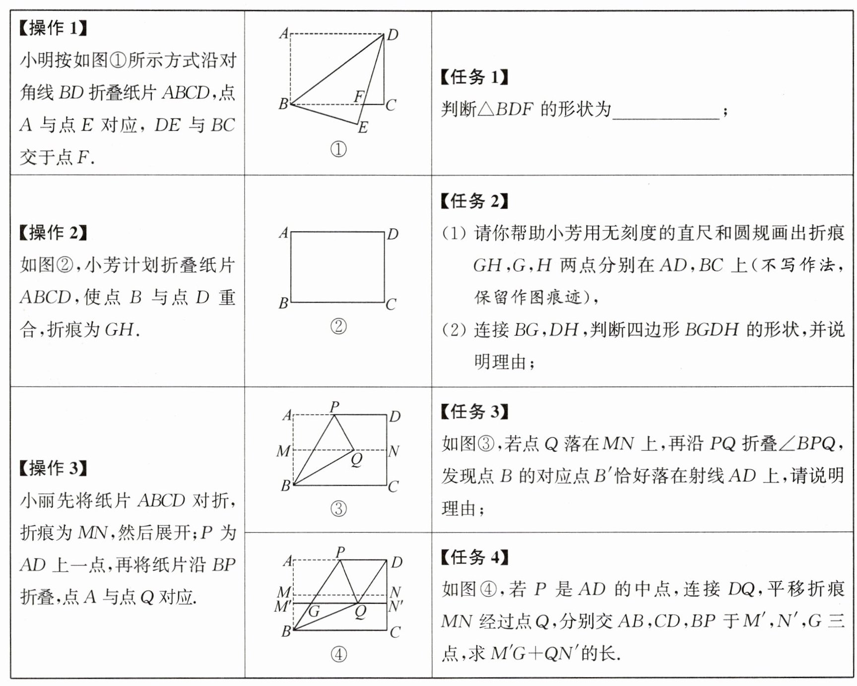 【任务4】由题意,得AD = BC = 8,M′N′//MN//AD,AM′//DN′,所以四边形AM′N′D是平行四边形,即M′N′ = AD = 8.所以M′G + QN′ = M′N′ - GQ = 8 - GQ.由折叠的性质,得AP = PQ,∠APB = ∠BPQ.又AD//M′N′,所以∠APB = ∠PGQ,即∠PGQ = ∠BPQ.所以PQ = GQ.又P是AD的中点,所以AP = $\frac{1}{2}$AD = 4,即GQ = PQ = 4.所以M′G + QN′ = 4.