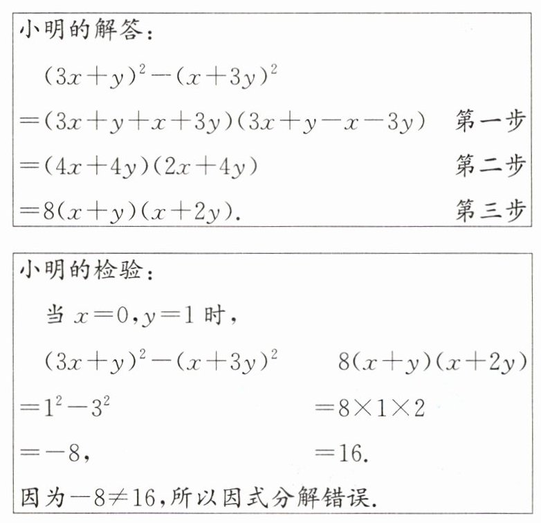 情境素材因式分解:$(3x + y)^{2}-(x + 3y)^{2}$.小明因式分解后,通过代入特殊值检验时,发现左右两边的值不相等,下面是他的解答和检验过程,请认真阅读并完成相应的任务.