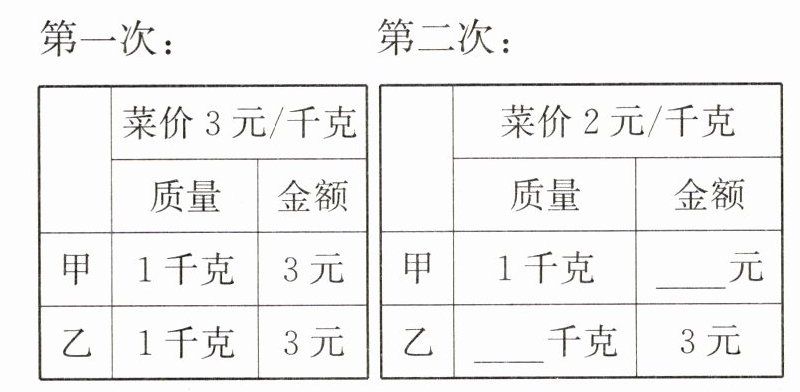 (2)计算甲两次买菜的均价和乙两次买菜的均价(均价 $ = $ 总金额 $ ÷ $ 总质量)。
