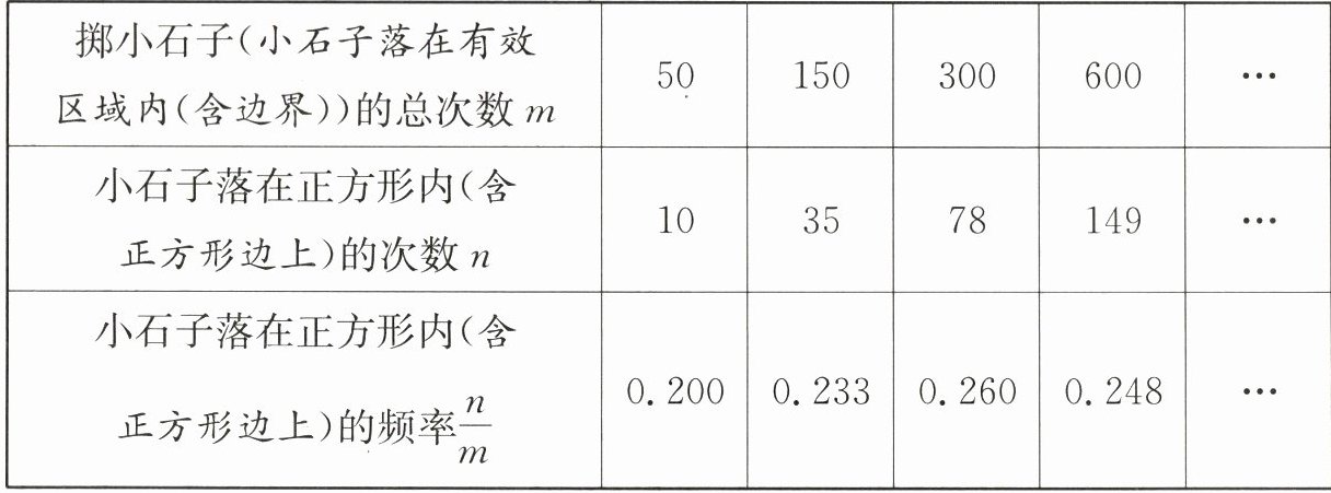 (1)根据表格,如果你掷一次小石子,那么小石子落在正方形内(含正方形边上)的概率约为