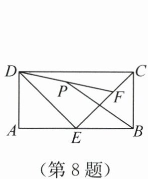 答案:8.D 解析:分别取DE,CD的中点P₁,P₂,连接PP₁,PP₂,P₁P₂,P₂B,则P₁P₂//CE.因为四边形ABCD是矩形,AB=4,AD=2,所以∠BCD=∠ABC=90°,CD=AB=4,BC=AD=2,即CP₂=DP₂=$\frac{1}{2}$CD=2.又E为AB的中点,所以AE=BE=$\frac{1}{2}$AB=2,即BE=BC.所以△BCE是等腰直角三角形,即∠BCE=45°.所以∠DCE=90° - ∠BCE=45°.又P₁P₂//CE,所以∠P₁P₂C+∠DCE=180°,即∠P₁P₂C=180° - ∠DCE=135°.同理,得△BCP₂是等腰直角三角形,所以∠CP₂B=45°,即∠BP₂P₁=∠P₁P₂C - ∠CP₂B=90°.所以BP₂⊥PP₂.在Rt△BCP₂中,由勾股定理,得BP₂=$\sqrt{BC^{2}+CP_{2}^{2}}$=$\sqrt{8}$.又P是DF的中点,所以PP₂//CF,PP₁//EF.又C,F,E三点共线,所以P₁,P₂,P三点共线,即点P在线段P₁P₂上.所以当BP⊥P₁P₂时,PB的长最小,即当P,P₂两点重合时,PB的长最小,且最小值为BP₂的长.所以PB的长的最小值是$\sqrt{8}$.