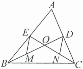 答案:20.(1)连接MN,DE.因为M,N分别是OB,OC的中点,所以MN//BC,MN=$\frac{1}{2}$BC.又BD,CE是△ABC的中线,所以D是AC的中点,E是AB的中点.所以DE//BC,DE=$\frac{1}{2}$BC.所以DE//MN,DE=MN.所以四边形DEMN是平行四边形,即MD和NE互相平分.