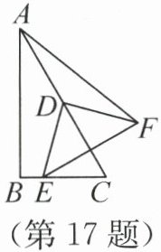 答案:17.$\sqrt{3}$ + 1 解析:如图,过点D作DM⊥BC于点M,过点F作FJ⊥DM于点J,延长FJ交AB于点N,则∠DMC=∠DMB=∠FJD=∠MJN=90°.又∠ABC=90°,所以四边形BMJN是矩形,即JN=BM.在Rt△ABC中,∠BAC=30°,BC=2,所以AC=2BC=4.又∠ABC=∠DMC=90°,所以DM//AB,即∠CDM=∠BAC=30°.又D是AC的中点,所以DM是△ABC的中位线,CD=$\frac{1}{2}$AC=2,即M是BC的中点.所以BM=CM=$\frac{1}{2}$BC=1,即JN=1.在Rt△CDM中,由勾股定理,得DM=$\sqrt{CD^{2}-CM^{2}}$=$\sqrt{3}$.由旋转的性质,得∠EDF=90°,DE=DF,所以∠FDJ+∠EDM=90°.又∠EDM+∠DEM=90°,所以∠FDJ=∠DEM.所以△FJD≌△DME(AAS).所以FJ=DM=$\sqrt{3}$,即FN=FJ+JN=$\sqrt{3}$ + 1.所以点F在直线l上运动(直线l与直线AB之间的距离为$\sqrt{3}$ + 1).由垂线段最短,得当AF⊥直线l时,AF的长最小,且最小值为$\sqrt{3}$ + 1.