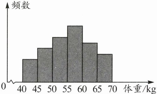 13. 为了解全区 5 000 名初中毕业生的体重情况,随机抽测了 200 名学生的体重,频数分布直方图如图所示(每小组数据含最小值,不含最大值),其中从左至右前四个小长方形的高之比为 $ 2 : 3 : 4 : 5 $,且体重小于 $ 50 \mathrm{ kg} $ 的学生人数占抽测总人数的 $ \dfrac{1}{4} $,由此可估计全区初中毕业生的体重不小于 $ 60 \mathrm{ kg} $ 的学生人数约为