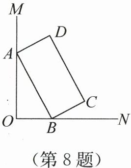 8. 如图,$ \angle MON = 90^{\circ} $,矩形 $ ABCD $ 的顶点 $ A $,$ B $ 分别在边 $ OM $,$ ON $ 上,当点 $ B $ 在边 $ ON $ 上运动时,点 $ A $ 随之在边 $ OM $ 上运动,且矩形 $ ABCD $ 的形状保持不变,其中 $ AB = 2 $,$ BC = 1 $. 在运动过程中,点 $ D $ 到点 $ O $ 的最大距离为(