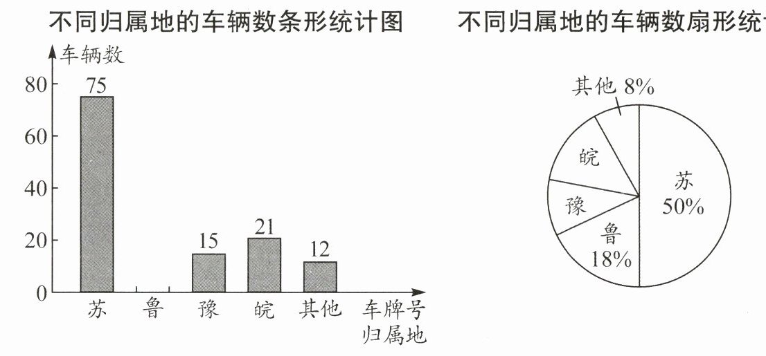 答案:21.(1)150 36 解析:由题图,得小桐共调查了75÷50%=150(辆)车,则“豫”对应扇形圆心角的度数为$360°$×$\frac{15}{150}$=$36°$. (2)由(1),得小桐共调查了150辆车,则其中车牌号归属地为“鲁”的车辆数为150×18%=27.所以补全条形统计图如图所示: 不同归属地的车辆数条形统计图
