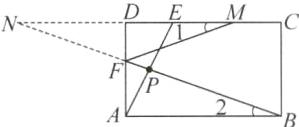 ②结论仍然成立. 理由如下:如图,延长BF,CD交于点N.因为P为线段AE的中点,所以AP=PE.由(1),得AB//CD,AB=CD,FD⊥MN,所以∠PEN=∠PAB,∠2=∠N.所以△APB≌△EPN(AAS).所以AB=EN,即CD=AB=EN.所以CD - DE=EN - DE,即CE=DN.又DE=CM,所以DE+EM=CM+EM,即DM=CE.所以DN=DM.因为FD⊥MN,所以FN=FM.所以∠N=∠1,即∠1=∠2.所以∠DMF=∠ABF.