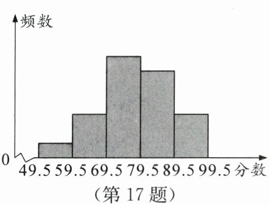 17. 某校在“数学小论文”评比活动中,共征集到论文若干篇,对论文评比的分数(分数为整数)整理分组后,绘制出频数分布直方图(如图). 若从左到右5个小长方形的高之比为1∶3∶7∶6∶3,且中间三组的频数之和为80,则在这次评比中被评为优秀论文(分数大于或等于80为优秀)的有