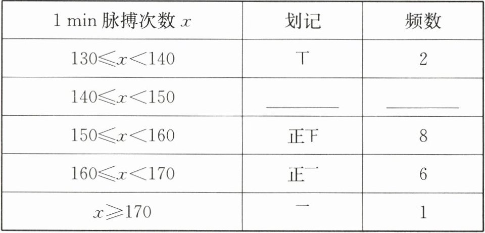 数据观念 某校抽取八(1)班20名学生,测量了他们在800m赛跑后1min的脉搏次数,结果如下:144,150,156,165,171,149,162,160,135,159,150,164,168,153,158,139,161,157,154,147.