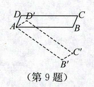 答案:9.A 解析:如图,因为四边形$ABCD$为平行四边形,$AB = 13$,所以$CD = AB = 13$,$\angle D = \angle ABC$.由旋转的性质,得$AD' = AD$,$C'D' = CD = 13$,$\angle AD'C' = \angle D$.所以$\angle AD'C' = \angle ABC$.又$\angle AD'C' + \angle 1 = 180^{\circ}$,$\angle ABC + \angle 2 = 180^{\circ}$,所以$\angle 1 = \angle 2$,即$BC' = C'D' = 13$.又$AD = 3$,所以$AD' = 3$,即$BD' = AB - AD' = 10$.过点$C'$作$C'H ⊥ AB$于点$H$,则$D'H = BH = \frac{1}{2}BD' = 5$.在