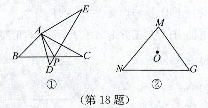 18. 问题背景:如图①,将 $ \triangle ABC $ 绕点 $ A $ 按逆时针方向旋转 $ 60^{\circ} $ 得到 $ \triangle ADE $,连接 $ PA $,$ DE $ 与 $ BC $ 交于点 $ P $,可推出结论:$ PA + PC = PE $。