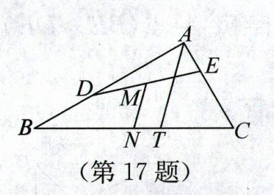 17. (2025·江苏盐城模拟)如图,在 $ \mathrm{Rt} \triangle ABC $ 中,$ \angle BAC = 90^{\circ} $,$ \angle B = 30^{\circ} $,$ D $,$ E $ 两点分别在边 $ AB $,$ AC $ 上,且 $ BD = CE $,连接 $ DE $,$ M $,$ N $ 分别为线段 $ DE $,$ BC $ 的中点,过点 $ A $ 作 $ AT // MN $ 交 $ BC $ 于点 $ T $。若 $ AC = 1 $,则 $ NT = $