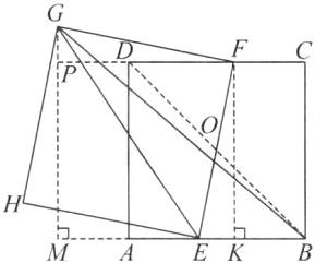 答案:10.C 解析:如图,连接$BD$交$EF$于点$O$,过点$F$作$FK ⊥ AB$于点$K$,过点$G$作$GM ⊥ AB$,交$BA$的延长线于点$M$,延长$CD$交$GM$于点$P$.因为四边形$ABCD$和四边形$EFGH$都是正方形,所以$EF = FG$,$AB = CD = AD$,$AB // CD$,$\angle EFG = 90^{\circ}$.所以$\angle ODF = \angle OBE$,$\angle OFD = \angle OEB$,$FK ⊥ CD$,即$\angle DFK = 90^{\circ}$.所以$\angle EFG - \angle DFE = \angle DFK - \angle DFE$,即$\angle GFP = \angle EFK$.易得四边形$FKMP$和四边形$FKAD$都是矩形,所以$\angle EKF = \angle MPF = 90^{\circ}$,$FK = AD = PM$,$AK = DF$,即$\angle GPF = 180^{\circ} - \angle MPF = 90^{\circ}$.所以$\angle EKF = \angle GPF$.所以$\triangle GPF \cong \triangle EKF$(AAS).所以$FP = FK$,$GP = EK$.又$AB = 5$,$AE = 2$,所以$PM = PF = FK = AD = 5$,$BE = 3$.因为$EF$过正方形$ABCD$的中心,所以$OB = OD$.所以$\triangle DOF \cong \triangle BOE$(AAS).所以$DF = BE = 3$,即$AK = 3$.所以$EK = AK - AE = 1$,即$GP = 1$.所以$GM = GP + PM = 6$.所以$S_{\triangle BEG} = \frac{1}{2}BE · GM = 9$.