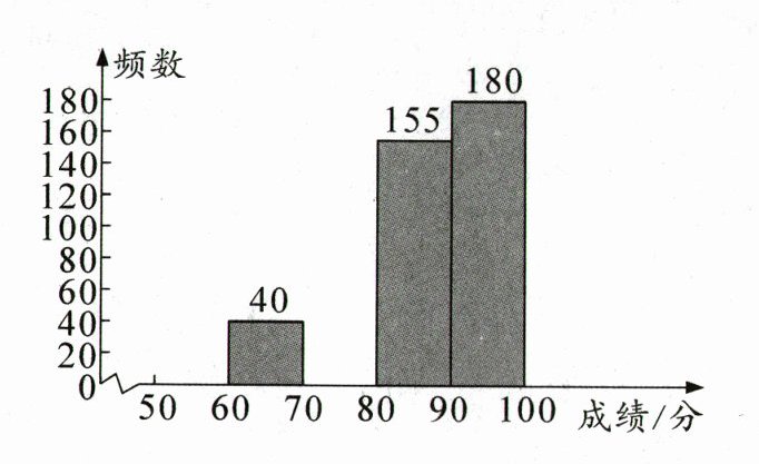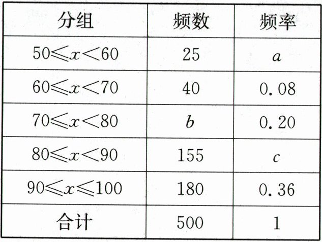 数据观念某区有 10 000 名中学生参加安全应急预案知识竞赛,为了解本次知识竞赛的成绩分布情况,从中抽取了部分学生的成绩 $ x $(单位:分)进行分组统计(成绩取整数,满分为 100 分),并绘制了如下统计表和如图所示的频数分布直方图。