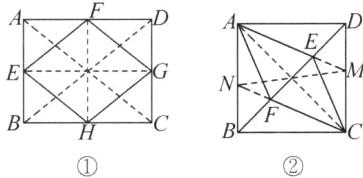 ②$a \leq -5 - \frac{\sqrt{2}}{2}$或$-3 + \frac{\sqrt{2}}{2} \leq a \leq 1 - \frac{\sqrt{2}}{2}$或$a \geq 3 + \frac{\sqrt{2}}{2}$. 解析:由题意,得$E$,$G$两点在直线$y = -x$上,$F$,$H$两点在直线$y = -x + 2$上,四边形$EFHG$是平行四边形.易得直线$AB$的函数表达式为$y = x + 6$,直线$CD$的函数表达式为$y = x - 6$.分类讨论如下:当四边形$EFHG$在$AB$上方时,设直线$AB$与直线$FH$的交点为$M$,则$d(W$,四边形$ABCD) = HM$.易得点$M$的坐标为$(-2,4)$.当$d(W$,四边形$ABCD) = 1$时,$HM = 1$,则点$H$的坐标为$(-2 - \frac{\sqrt{2}}{2},4 + \frac{\sqrt{2}}{2})$.又点$H$的坐标为$(a + 3,-a -1)$,所以$a + 3 = -2 - \frac{\sqrt{2}}{2}$,$-a - 1 = 4 + \frac{\sqrt{2}}{2}$,解得$a = -5 - \frac{\sqrt{2}}{2}$.所以当$d(W$,四边形$ABCD) \geq 1$时,$a \leq -5 - \frac{\sqrt{2}}{2}$;同理,得当四边形$EFHG$在$x$轴上方,$AB$下方时,$a \geq -3 + \frac{\sqrt{2}}{2}$;当四边形$EFHG$在$x$轴下方,$CD$上方时,$a \leq 1 - \frac{\sqrt{2}}{2}$;当四边形$EFHG$在$CD$下方时,$a \geq 3 + \frac{\sqrt{2}}{2}$.综上,$a$的取值范围为$a \leq -5 - \frac{\sqrt{2}}{2}$或$-3 + \frac{\sqrt{2}}{2} \leq a \leq 1 - \frac{\sqrt{2}}{2}$或$a \geq 3 + \frac{\sqrt{2}}{2}$.