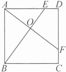 5. (2025·四川德阳·8分)在综合实践活动中,同学们对学校的一个正方形花园$ABCD$进行测量并规划使用。如图,$E$,$F$两点处是它的两个门,且$DE = CF$,要修建两条直路$AF$,$BE$,$AF$与$BE$相交于点$O$(两个门$E$,$F$的大小忽略不计)。