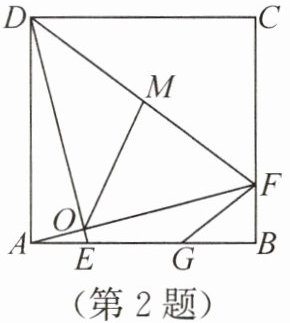 2. (2024·四川泸州·3分)如图,在边长为6的正方形$ABCD$中,$E$,$F$分别是边$AB$,$BC$上的动点,且满足$AE = BF$,$AF$与$DE$交于点$O$,$M$是$DF$的中点,$G$是边$AB$上的点,$AG = 2GB$,连接$OM$,$FG$,则$OM+\frac{1}{2}FG$的最小值是(