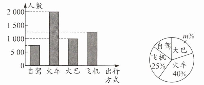 7.(3分)“元旦”期间相关部门对到昆明观光旅游的游客的出行方式进行了随机抽样调查,整理后绘制成如图所示的两幅统计图. 有下列四个说法:① 本次抽样调查的样本容量是5000;② 扇形统计图中的m值为20;③ “自驾”对应的扇形圆心角的度数为54°;④ 若“元旦”期间到昆明观光旅游的游客有50万人,则估计选择“飞机”出行的有12000人. 其中,错误的是