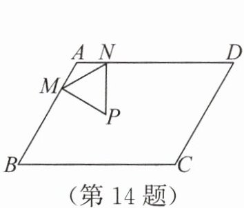 答案:14. 5 解析:如图,连接$AP$并延长,交$BC$于点$P'$,过点$P'$分别作$P'M'// PM$,交$AB$于点$M'$,$P'N'// PN$,交$AD$于点$N'$,连接$M'N'$。因为四边形$ABCD$是平行四边形,所以$AD=BC$,$AD// BC$,即$\angle B+\angle BAD=180^{\circ}$。又$\angle B=60^{\circ}$,所以$\angle BAD=180^{\circ}-\angle B=120^{\circ}$。又$\triangle MNP$是等边三角形,所以$MP=NP$,$\angle MPN=60^{\circ}$。又$AM=AN$,$AP=AP$,所以$\triangle AMP\cong\triangle ANP(SSS)$。所以$\angle MAP=\angle NAP=\frac{1}{2}\angle BAD=60^{\circ}$,$\angle APN=\angle APM=\frac{1}{2}\angle MPN=30^{\circ}$。所以点$P$在$\angle BAC$的平分线上运动,当点$P$落在边$BC$上时,$\triangle MNP$的面积最大,此时$P$,$P'$两点重合。因为$\angle BAP'=\angle B=60^{\circ}$,所以$\angle BP'A=180^{\circ}-\angle B-\angle BAP'=60^{\circ}$,即$\triangle ABP'$是等边三角形。又$AB=6$,所以$AP'=AB=6$。又$P'N'// PN$,所以$\angle AP'N'=\angle APN=30^{\circ}$。所以$\angle BP'N'=\angle AP'B+\angle AP'N'=90^{\circ}$。又$AD// BC$,所以$\angle AN'P'=180^{\circ}-\angle BP'N'=90^{\circ}$,即$AN'=\frac{1}{2}AP'=3$。又$AD=8$,所以$DN'=AD - AN'=5$,即当$\triangle MNP$的面积最大时,$DN'$的长为$5$。