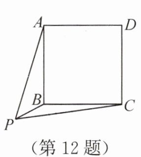 答案:12. $45^{\circ}$ 解析:如图,将$\triangle BPC$绕点$B$按逆时针方向旋转$90^{\circ}$,得$\triangle BP'A$,连接$PP'$。由题意,得$P'A=PC=\sqrt{11}$,$P'B=PB=1$,$\angle PBP'=90^{\circ}$。所以$\triangle PBP'$是等腰直角三角形,即$\angle P'PB=45^{\circ}$。在$Rt\triangle PBP'$中,由勾股定理,得$PP'=\sqrt{P'B^{2}+PB^{2}}=\sqrt{2}$。因为$PA=3$,$PP'=\sqrt{2}$,$P'A=\sqrt{11}$,所以$PA^{2}+PP'^{2}=P'A^{2}$。所以$\triangle P'AP$为直角三角形,且$\angle APP'=90^{\circ}$。所以$\angle APB=\angle APP'-\angle P'PB=45^{\circ}$。
