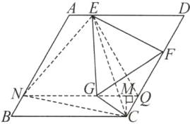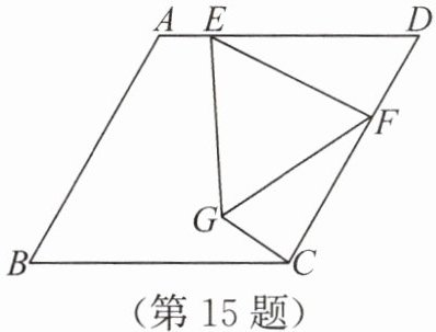 答案:15. $\sqrt{3}\leq d\leq\sqrt{84}$ 解析:如图,在$CD$上截取$DQ=DE$,连接$EQ$,$QG$,延长$QG$交$AB$于点$N$,连接$CN$,过点$C$作$CM⊥ NQ$于点$M$。因为四边形$ABCD$是菱形,所以$AB=AD=BC=CD$,$AB// CD$,$AD// BC$,$\angle B=\angle D$。因为$AB=10$,$AE=2$,$\angle B=60^{\circ}$,所以$AD=BC=CD=10$,$\angle D=60^{\circ}$,$DQ=DE=AD - AE=8$。所以$\triangle DEQ$是等边三角形。所以$EQ=DE=8$,$\angle DEQ=60^{\circ}$。因为$\triangle EFG$是等边三角形,所以$EG=EF$,$\angle GEF=60^{\circ}$。所以$\angle DEQ - \angle FEQ=\angle GEF - \angle FEQ$,即$\angle DEF=\angle QEG$。所以$\triangle DEF\cong\triangle QEG(SAS)$。所以$\angle EQG=\angle D=60^{\circ}$,即$\angle EQG=\angle DEQ=60^{\circ}$。所以$AD// NQ$。所以$\angle NQC=\angle D=60^{\circ}$,即点$G$在线段$NQ$上运动。又$AD// BC$,所以$NQ// BC$。又$AB// CD$,所以四边形$BNQC$是平行四边形。所以$NQ=BC=10$,$BN=CQ=2$,即$AN=AB - BN=8$。又$\angle MCQ=90^{\circ}-\angle NQC=30^{\circ}$,所以$MQ=\frac{1}{2}CQ=1$。在$Rt\triangle CMQ$中,由勾股定理,得$CM=\sqrt{CQ^{2}-MQ^{2}}=\sqrt{3}$。所以$MN=NQ - MQ=9$。在$Rt\triangle CMN$中,由勾股定理,得$CN=\sqrt{CM^{2}+MN^{2}}=\sqrt{84}$。连接$EN$,$CE$。又$AD// BC$,所以$\angle A+\angle B=180^{\circ}$,即$\angle A=180^{\circ}-\angle B=120^{\circ}$。又$\angle EQC=\angle EQG+\angle NQC=120^{\circ}$,所以$\angle A=\angle EQC$。又$AN=QE=8$,$AE=QC=2$,所以$\triangle AEN\cong\triangle QCE(SAS)$。所以$\angle ANE=\angle QEC$,$EN=CE$。又$\angle ANE+\angle AEN=180^{\circ}-\angle A=60^{\circ}$,所以$\angle QEC+\angle AEN=60^{\circ}$,即$\angle NEC=180^{\circ}-\angle AEN-\angle QEC-\angle DEQ=60^{\circ}$。所以$\triangle CEN$是等边三角形。又$F$是边$CD$上一动点,所以当$D$,$F$两点重合时,$G$,$Q$两点重合;当$F$,$C$两点重合时,$N$,$G$两点重合。所以当$G$,$M$两点重合时,$CG$的长最小,且最小值为$CM$的长,即$\sqrt{3}$;当$G$,$N$两点重合时,$CG$的长最大,且最大值为$CN$的长,即$\sqrt{84}$。又$CG$的长为$d$,所以$d$的取值范围为$\sqrt{3}\leq d\leq\sqrt{84}$。
