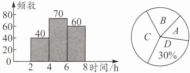 (2)由(1),得本次被调查的学生人数为$200$,所以其中每周阅读时间为$A$:$0\leqslant x<2$的学生人数为$200 - 40 - 70 - 60 = 30$.补全频数分布直方图略.