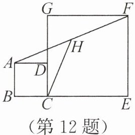 答案:12. $\frac{13}{2}$ 解析:如图,连接$AC$,$CF$.因为四边形$ABCD$和四边形$CEFG$都是正方形,且$BC=\frac{7}{2}$,$CE=\frac{17}{2}$,所以$AB=BC=\frac{7}{2}$,$EF=CE=\frac{17}{2}$,$\angle E=\angle B=90^{\circ}$,$\angle ACD=\angle GCF=45^{\circ}$,即$\angle ACF=90^{\circ}$.在$Rt\triangle ABC$和$Rt\triangle CEF$中,由勾股定理,得$AC^{2}=AB^{2}+BC^{2}=\frac{49}{2}$,$CF^{2}=CE^{2}+EF^{2}=\frac{289}{2}$.在$Rt\triangle ACF$中,由勾股定理,得$AF=\sqrt{AC^{2}+CF^{2}}=13$.又$H$是$AF$的中点,所以$CH=\frac{1}{2}AF=\frac{13}{2}$.