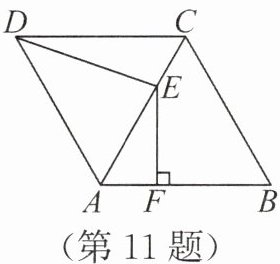 答案:11. $\sqrt{7}$ 解析:如图,连接$BD$交$AC$于点$O$.因为四边形$ABCD$是菱形,$AB=3$,$\angle ABC=60^{\circ}$,所以$AB=BC=CD=AD=3$,$\angle ADC=\angle ABC=60^{\circ}$,$AC⊥ BD$,$OA=OC$.所以$\triangle ABC$和$\triangle ACD$都是等边三角形.所以$\angle CAB=60^{\circ}$,$AC=AB=3$.所以$OA=OC=\frac{1}{2}AC=\frac{3}{2}$.在$Rt\triangle AOD$中,由勾股定理,得$OD^{2}=AD^{2}-OA^{2}=\frac{27}{4}$.因为$EF⊥ AB$,所以$\angle AEF=90^{\circ}-\angle CAB=30^{\circ}$.所以$AF=\frac{1}{2}AE$.又$AC=AE+CE$,$CE=AF$,所以$AE+AF=AC=3$,即$AE=2$,$AF=1$.所以$OE=AE - OA=\frac{1}{2}$.在$Rt\triangle ODE$中,由勾股定理,得$DE=\sqrt{OD^{2}+OE^{2}}=\sqrt{7}$,则$DE$的长为$\sqrt{7}$.