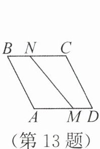 答案:13. $\frac{130}{7}$ 解析:如图,过点$B$作$BE⊥ AD$,交$DA$的延长线于点$E$。当点$M$运动到点$D$处,点$N$运动到点$B$处时,$MN$的长最大,所以$BD=\sqrt{65}$。当$MN⊥ AD$时,$MN$的长最小,所以$BE = 4$。在$\mathrm{Rt}\triangle DBE$中,由勾股定理,得$DE=\sqrt{BD^{2}-BE^{2}} = 7$。因为四边形$ABCD$是菱形,所以$AD = AB = BC$。设$AD = x$,则$AB = x$,$AE = 7 - x$。在$\mathrm{Rt}\triangle ABE$中,由勾股定理,得$BE^{2}+AE^{2}=AB^{2}$,所以$4^{2}+(7 - x)^{2}=x^{2}$,解得$x=\frac{65}{14}$,则$AD=\frac{65}{14}$。所以菱形$ABCD$的面积为$AD· BE=\frac{65}{14}×4=\frac{130}{7}$。