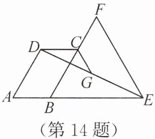 答案:14. $\frac{3}{2}$ 解析:延长$CG$交$BE$于点$H$,则$\angle DGC=\angle EGH$。又四边形$ABCD$是平行四边形,$AB = 2$,$AD =3$,所以$AB// CD$,$CD = AB = 2$,$BC = AD = 3$。又点$E$在$AB$的延长线上,所以$CD// EH$。所以$\angle CDG=\angle HEG$。又$G$为$DE$的中点,所以$DG = EG$。所以$\triangle DCG\cong\triangle EHG(ASA)$。所以$EH = DC = 2$,$HG = CG=\frac{1}{2}CH$。又$CF = 2$,所以$BF = BC + CF = 5$。又$\triangle BEF$是等边三角形,所以$\angle EBF = 60^{\circ}$,$BE = BF = 5$。所以$BH = BE - EH = 3$。则$BC = BH$。所以$\triangle BCH$是等边三角形。所以$CH = BH = 3$,即$CG=\frac{3}{2}$。