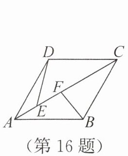 答案:16. $\sqrt{29}$ 解析:连接$BD$。因为四边形$ABCD$是边长为$5$的菱形,所以$AB = AD = 5$,$AC⊥ BD$。因为$\angle BAD = 60^{\circ}$,所以$\triangle ADB$是等边三角形,即$BD = AB = 5$。以$DE$,$EF$为边作平行四边形$DEFG$,连接$BG$,则$DG// AC$,$DG = EF$,$FG = DE$,即$BD⊥ DG$。所以$\angle BDG = 90^{\circ}$。又$EF = 2$,所以$DG = 2$。在$\mathrm{Rt}\triangle BDG$中,由勾股定理,得$BG=\sqrt{DG^{2}+BD^{2}}=\sqrt{29}$。所以$DE + BF = FG + BF\geqslant BG$,即当$B$,$F$,$G$三点共线时,$DE + BF$取最小值,且最小值为$BG$的长。所以$DE + BF$的最小值为$\sqrt{29}$。