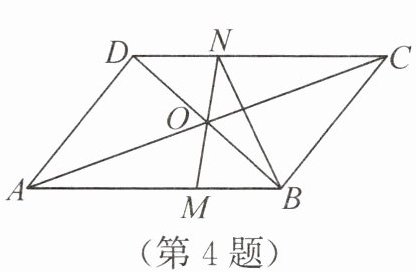 4. 如图,在$□ ABCD$中,$AB = 9$,$BC = 6$,对角线$AC$,$BD$相交于点$O$,经过点$O$的直线$MN$分别交$AB$,$CD$于$M$,$N$两点,连接$BN$,当$BN$恰好平分$\angle ABC$时,$BM$的长为(