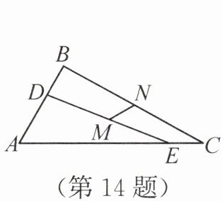 答案:14.$\sqrt{3}$ 解析:如图,过点C作CH//AB,连接DN 并延长,交CH 于点H,连接EH,过点C作CJ⊥EH于点J,则∠B = ∠NCH,∠A + ∠ECH = 180°。又∠A = 60°,所以∠ECH = 180° - ∠A = 120°。因为N是BC的中点,所以BN = CN。又∠DNB = ∠HNC,所以△DNB ≌ △HNC(ASA)。所以BD = CH,DN = HN。所以N是DH的中点。又M是DE的中点,所以MN是△DEH的中位线,即MN = $\frac{1}{2}$EH。因为BD = CE = 2,所以CE = CH = 2。所以∠CEJ = ∠CHJ,EH = 2EJ,即MN = EJ。又∠CEJ + ∠CHJ + ∠ECH = 180°,所以∠CEJ = $\frac{1}{2}$(180° - ∠ECH) = 30°。所以CJ = $\frac{1}{2}$EC = 1。在Rt△CEJ 中,由勾股定理,得EJ = $\sqrt{EC^{2}-CJ^{2}}$ = $\sqrt{3}$。所以MN = $\sqrt{3}$。