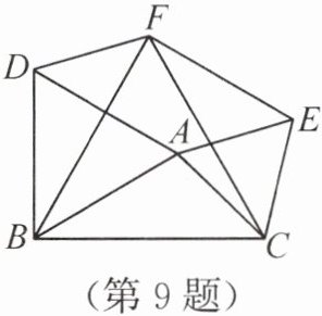 答案:9. 8 解析:过点E作EG⊥AD,交DA的延长线于点G,则∠AEG + ∠EAG = 90°. 因为△ABD,△ACE,△BCF 都是等边三角形,所以AB = BD = AD,AC = AE = CE,BC = CF = BF,∠ACE = ∠BCF = ∠ABD = ∠CBF = ∠BAD = ∠CAE = 60°. 所以∠BCF - ∠ACF = ∠ACE - ∠ACF,∠CBF - ∠ABF = ∠ABD - ∠ABF,即∠ACB = ∠ECF,∠ABC = ∠DBF. 所以△ABC≅△DBF≅△EFC(SAS). 所以DF = AC,AB = EF,即DF = AE,AD = EF. 所以四边形AEFD是平行四边形. 又∠BAC = 105°,所以∠EAG = ∠BAD + ∠BAC + ∠CAE - 180° = 45°,