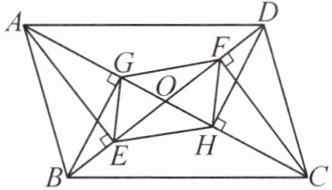答案:10. 四边形EHFG是平行四边形. 理由如下:因为四边形ABCD是平行四边形,所以OA = OC,OB = OD. 又AE⊥BD,CF⊥BD,BG⊥AC,DH⊥AC,所以∠AEO = ∠CFO = ∠BGO = ∠DHO = 90°. 又∠BOG = ∠DOH,∠AOE = ∠COF,所以△BOG ≅ △DOH (AAS),△AOE ≅ △COF (AAS). 所以OG = OH,OE = OF. 所以四边形EHFG是平行四边形.