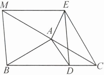 (3)由(1)(2),得△BAD ≅ △CAE,∠CME = ∠MCE,所以BD = CE,ME = CE,即BD = ME. 又EM//BC,所以四边形MBDE是平行四边形.