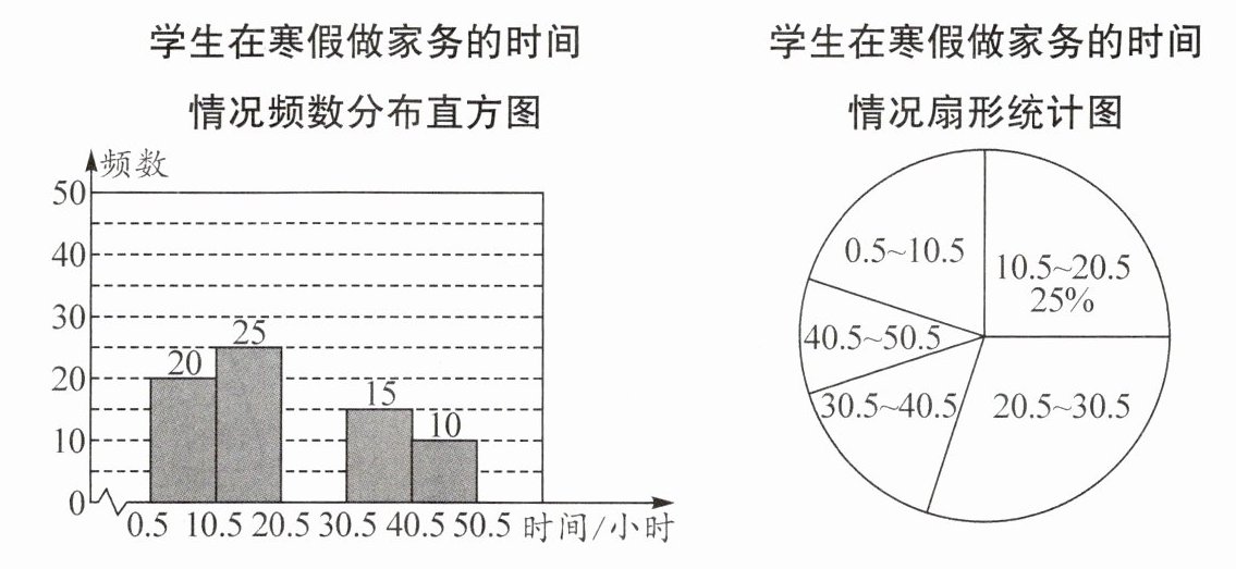 调查的学生中在寒假做家务时间在20.5~30.5小时的有100−20−25−15−10=30.补全频数分布直方图略.