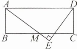 答案:【思路分析】连接 $DM$。因为四边形 $ABCD$ 是矩形,$AB = 3$,$AD = 8$,所以 $\angle B = 90^{\circ}$,$BC = AD = 8$,$S_{矩形ABCD} = AB · AD = 24$。因为 $M$ 为 $BC$ 的中点,所以 $BM = \dfrac{1}{2}BC = 4$。在 $Rt\triangle ABM$ 中,由勾股定理,得 $AM = \sqrt{AB^{2} + BM^{2}} = 5$。因为 $S_{\triangle ADM} = \dfrac{1}{2}S_{矩形ABCD} = 12$,$S_{\triangle ADM} = \dfrac{1}{2}AM · DE$,所以 $DE = \dfrac{2S_{\triangle ADM}}{AM} = 4.8$。