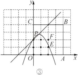 (3)由题意,得抛物线的顶点P的坐标为(m,m+2)。令x=m,y=m+2,则y=x+2,所以顶点P在直线y=x+2上。因为点P在正方形OABC内部,所以0<m<2。如图③,取点E(2,1),F(2,2)。观察图像可知,当点P在正方形OABC内部,该抛物线下方(包括边界)恰好存在8个好点时,抛物线与线段EF有交点(点F除外)。当抛物线经过点E时,−(2−m)²+m+2=1,解得m1=$\frac{5−\sqrt{13}}{2}$,m2=$\frac{5+\sqrt{13}}{2}$(不合题意,舍去);当抛物线经过点F时,−(2−m)²+m+2=2,解得m1=1,m2=4(不合题意,舍去)。故若点P在正方形OABC内部,该抛物线下方(包括边界)恰好存在8个好点,则m的取值范围为$\frac{5−\sqrt{13}}{2}$≤m<1。